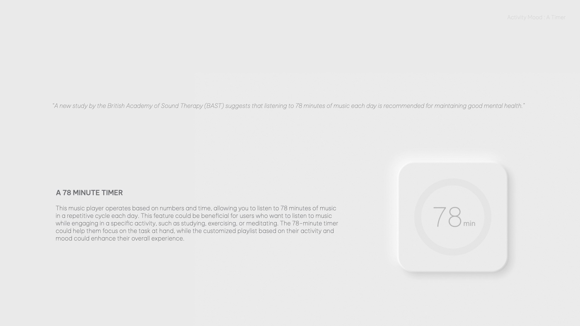 "Activity + Mood" is an intuitive music player as well as a 78-minute timer to help users focus on specific tasks while enjoying a customized playlist.