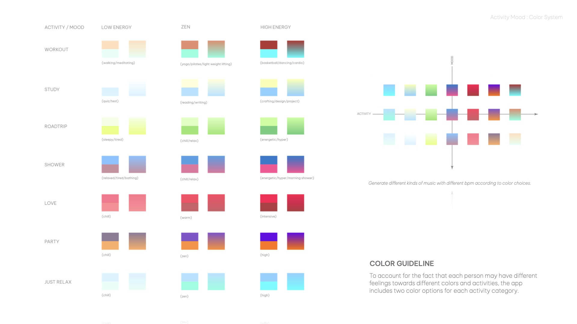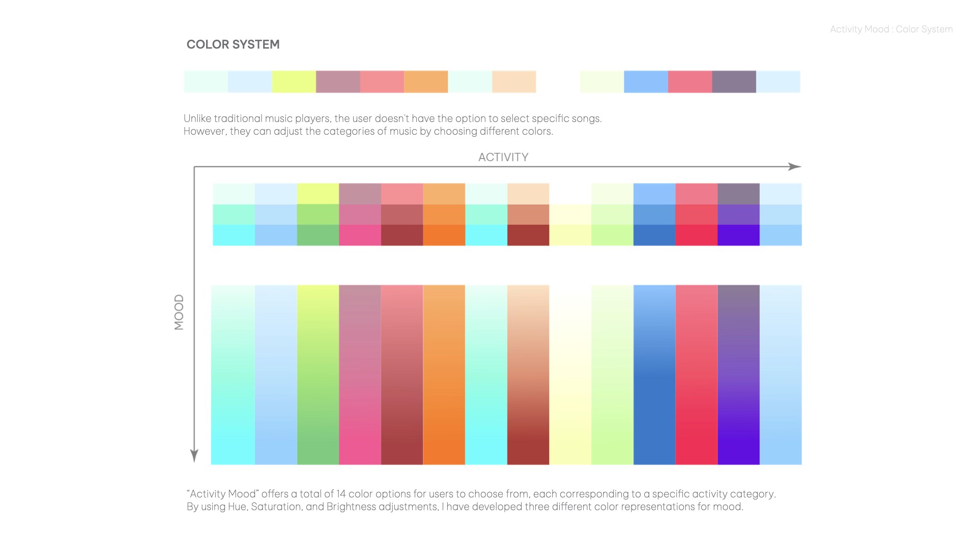 By utilizing Hue, Saturation, and Brightness adjustments, Activity Mood approach to music selection involves 14 different color options, each corresponding to a specific "activity" category, then three different color for mood "high", "zen" or "low" - making it easier for users to choose the right music for their current activity + mood.