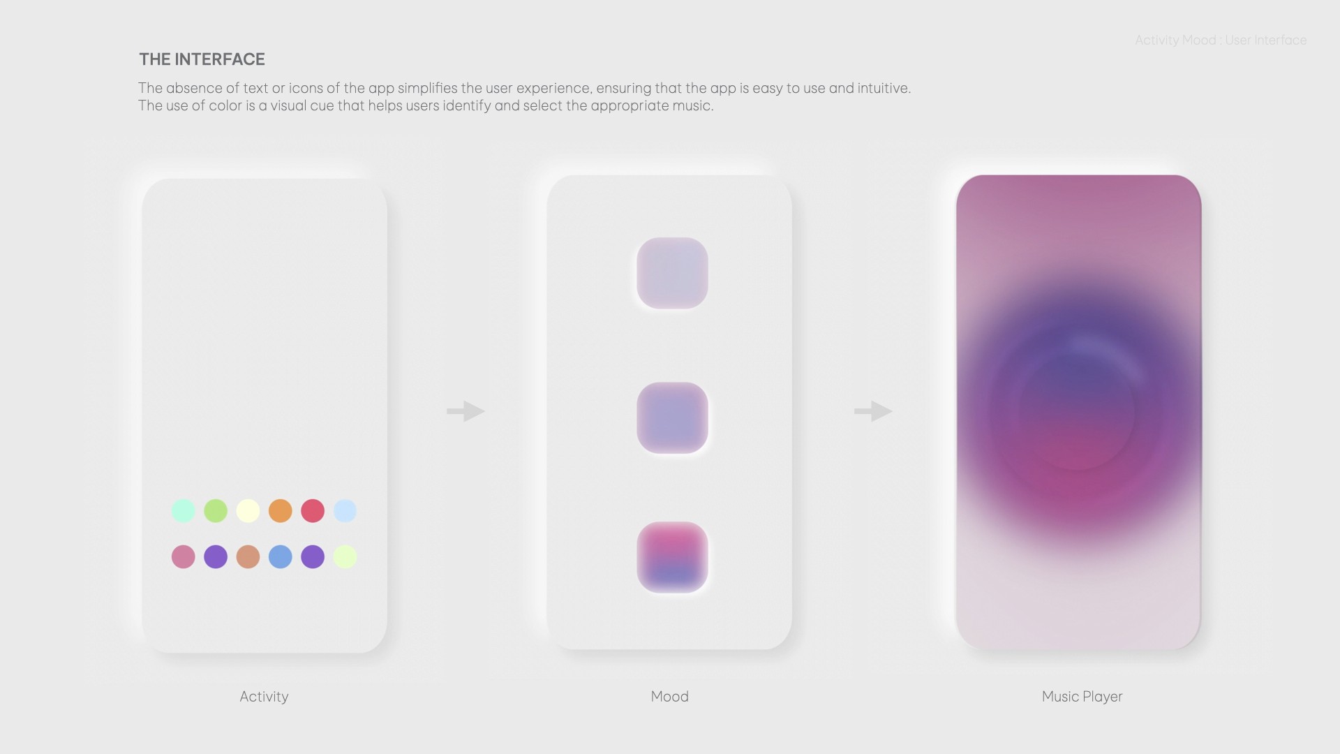The intuitive interface doesn't feature any text or icons, making it easy to navigate and use. The use of color as a visual cue provides users with a simple and engaging way to select the appropriate music for their needs.