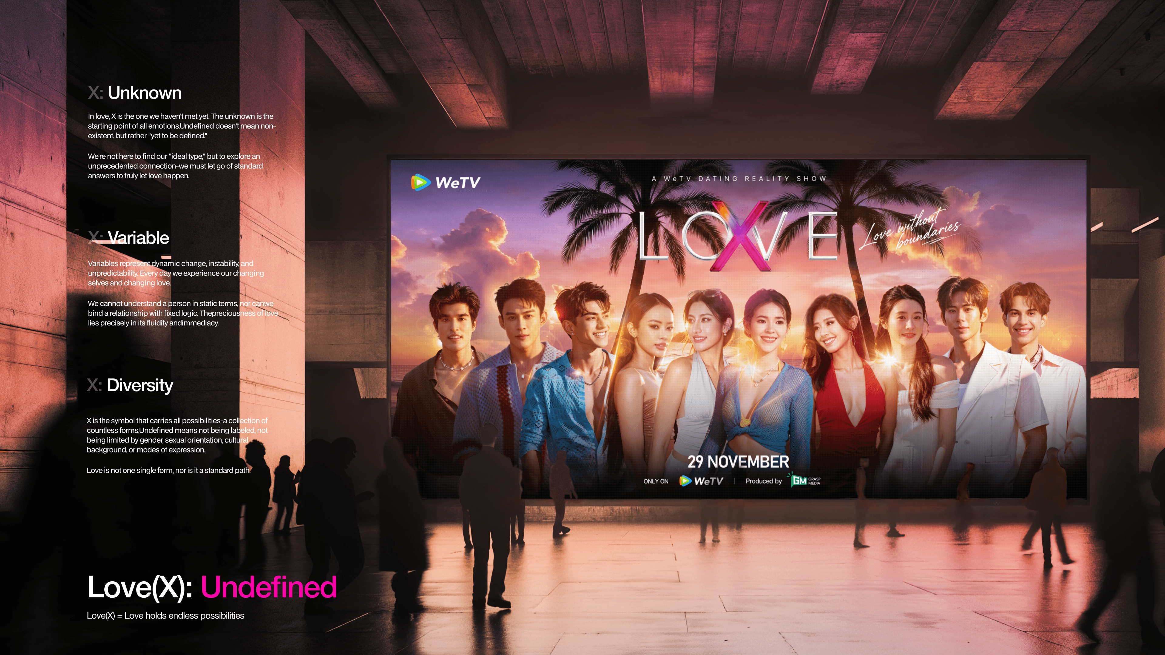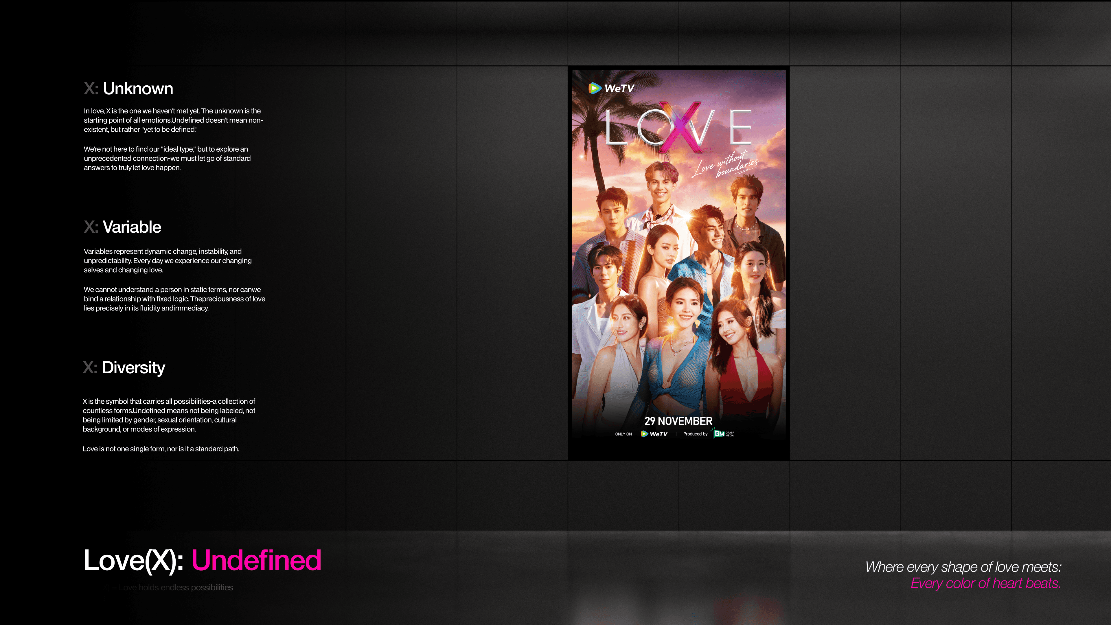 This project is built around the core concept “Love(X): Undefined”, examining love as something inherently open-ended and resistant to definition.